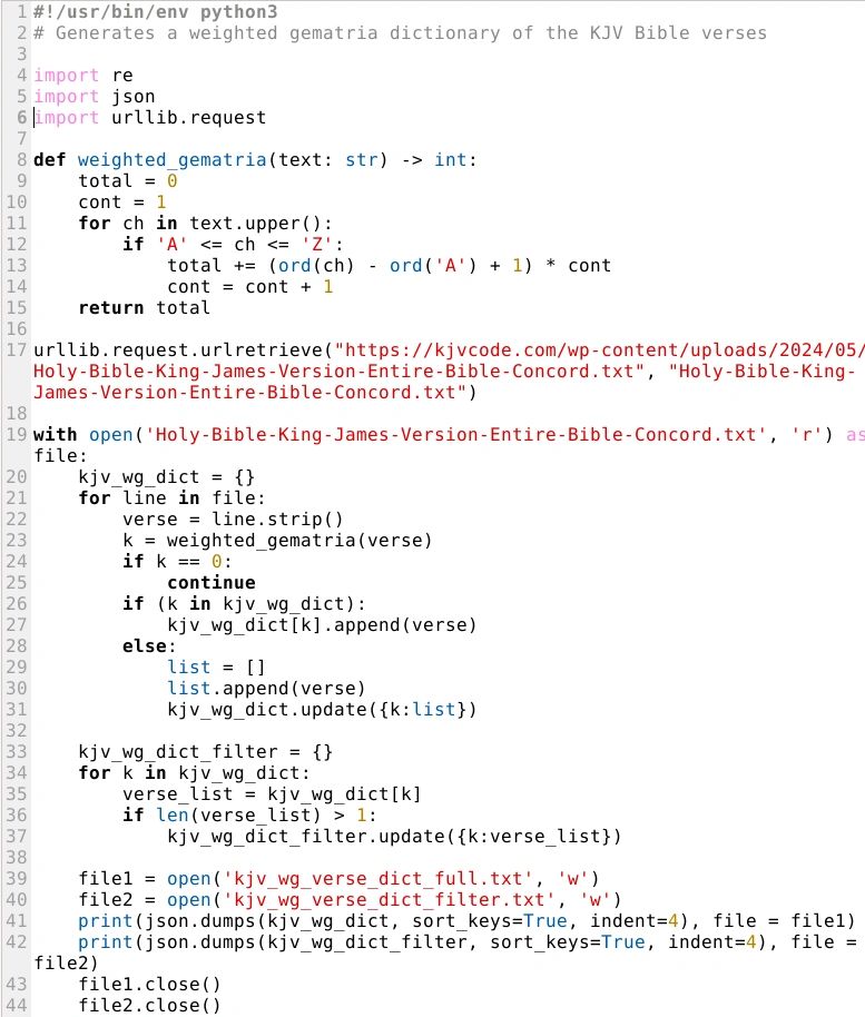This script creates an ordered dictionary of key-value pairs of the entire KJV Bible, where the key is the weighted gematric number and the value mapped to it is a list of all the words that get that value when the script is passed to each word. Example: "30": ["age", "babe", "ice"]